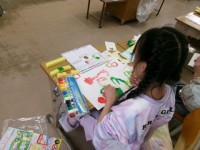 図工の時間に「ふしぎなたまご」の絵を描いています。カラフルなたまごが割れて、中からいろいろな物が飛び出します。動物や、お菓子、恐竜やお花など楽しい物がたくさん飛び出しました。