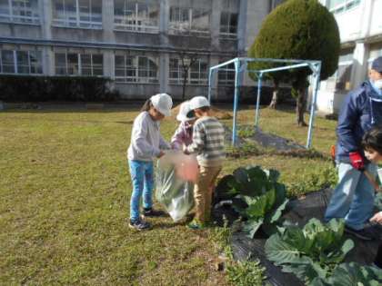 冬野菜の収穫をしました。大きく育っていました。2学期から、3学期にかけて順番に持って帰ります。