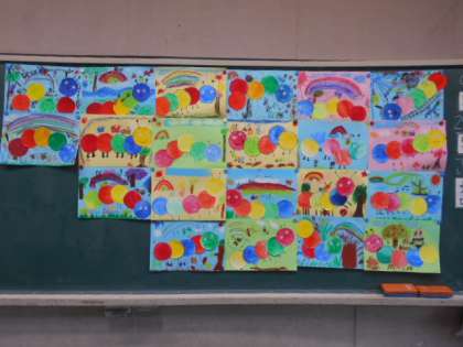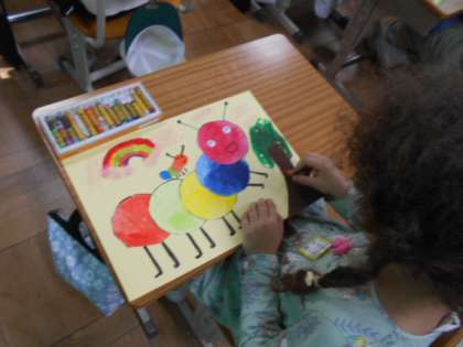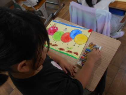 9月24日(火)【1年生】図工 公開日 2024/09/24 更新日 2024/09/24 1年生 図工の時間に、前回絵の具で描いた丸を使って、絵を描きました。丸をつなげてカラフルなあおむしにしました。まわりにクレパスで木や花、虫なども描きました。