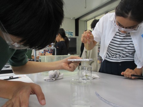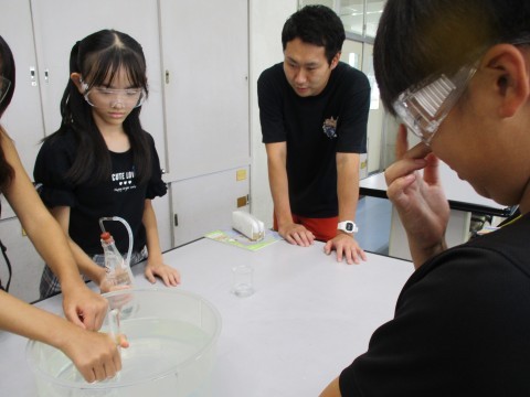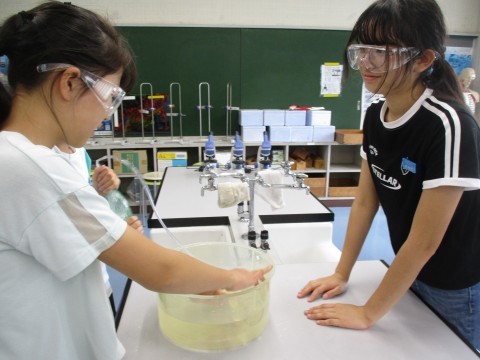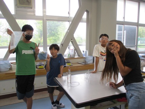 炭酸水の中に入っている気体は何かを予想し、自分たちで実験の計画を立てて調べていました。