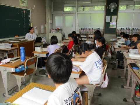 4年生の国語の授業の様子です。いま、新美南吉の「ごんぎつね」を学んでいるところです。本文をよく読み、様子を思い浮かべています。今日は、まだ前半の場面についてでした。ごんが、あなをほって、そこでまるくなっている様子を思いうかべ、「この教室やったら、どこにごんはいるかな?」という先生の問いに対して、「教室の端の先生の机のあたり」ということでした。実際に、机の下に入ってみて、どうやった?と先生が聞くと、「暗かった」「不安になる」という言葉がありました。「じゃあ、ごんも、あなの中でひとりぼっちでいたら」「さみしい」「不安になる」という意見が出ました。