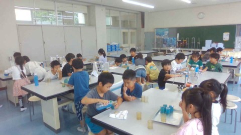 小さい容器に水を移し替えて、何杯分入るか、調べています。