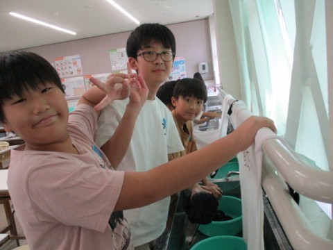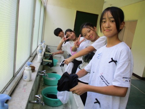 自分たちの体操服を、たらいで手洗いして汚れをとり、手で軽くしぼり、最後は洗濯機で脱水をしました。
