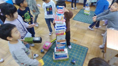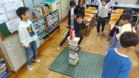 授業の終わりにはみんなでどれだけ高く積み上げられるかを競いました。