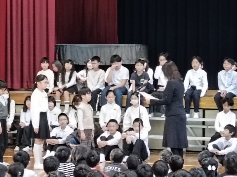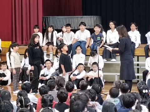夏休みに描いてきた作品が入賞し,朝会で表彰されました。