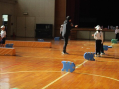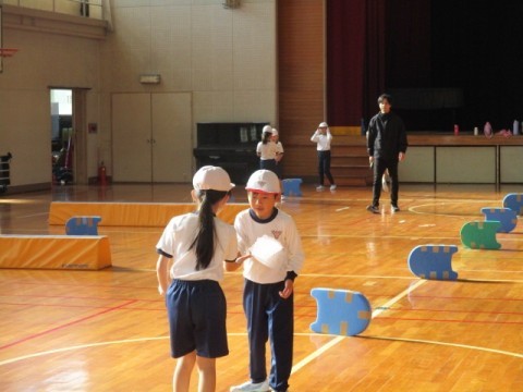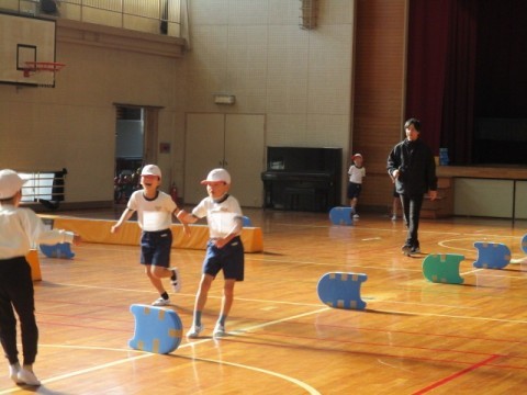 「ジャンプでリレー」を行いました。片足で踏み込むと,前にジャンプ,両足で踏み込むと上にジャンプできるのだそうです。子どもたちは,実感したでしょうか。とても盛り上がったリレーでした。