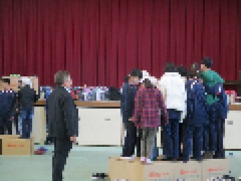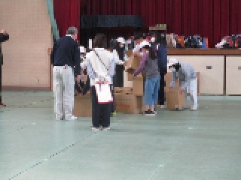 防災体験会の様子です。これは,毛布搬送の体験,段ボールベッドの組み立てを行っているところです。毛布は,両端をくるくると巻いて持ち上げると持ちやすいということがわかりました。