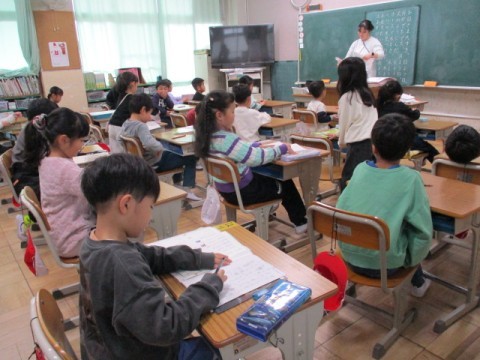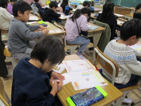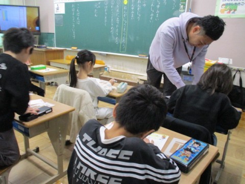 1年生の国語の授業の様子です。1組は,教科書の文章を視写していました。漢字を使ってしっかり書くことができていました。また2組は,年賀状を作成していました。それぞれ,だれにあてて書いたのでしょうか。郵便はがきを使って書いていました。届くのが楽しみですね。