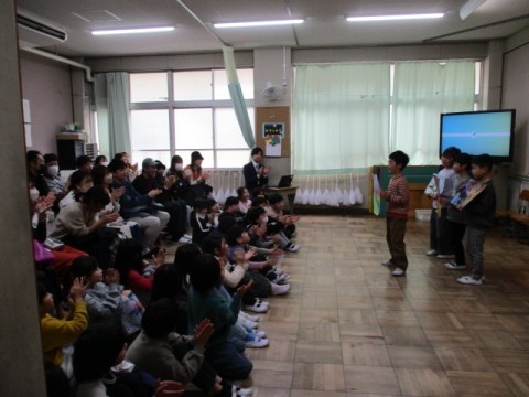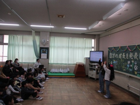 2年生の授業参観のようすです。生活科の発表会「自分が成長したこと」です。子どもたちは自分が「がんばった!」と思うこと,得意だと思っていることなどを発表しようと自分たちで決めました。発表のために,内容を考えたり,発表するための言葉だったりと,準備をしていました。はっきりと自分のことを表現できる2年生!今日の日だけでなく,ふだんの授業,毎日のがんばりを見ていると,一年でずいぶん成長したと実感しています。ほんとに「成長したね!」