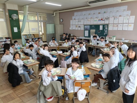 今日の給食は,手前に立っている女の子の提案で,2つの円の形にして食べました。