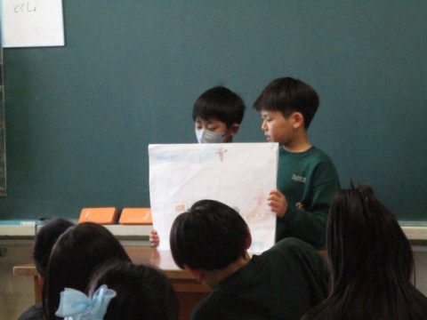 4年生の授業参観の様子です。4年生は総合的な学習の時間でそれぞれが調べた「SDGs」の発表をしていました。SDGs17の取組の中で自分が興味をもった分野についての説明と,どういった課題があるのか,また今後気を付けていきたいことについてを発表していました。1人1台端末を活用したパワーポイントでの発表や,画用紙でイラストを描いたりしての発表など,それぞれがやりたい方法で発表できました。声もしっかり出せていて,廊下にいても聞こえましたよ!