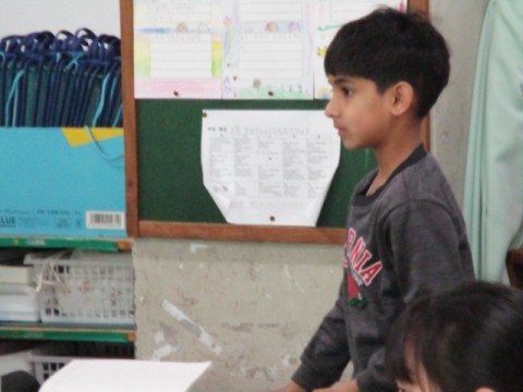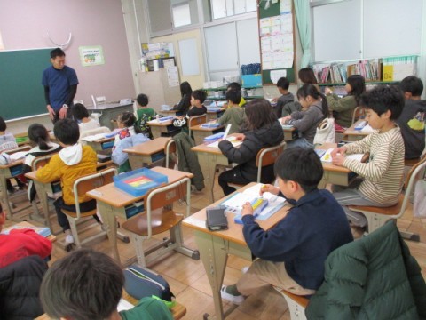 1年2組で公開授業がありました。算数「たしざんとひきざん」です。~ばんめという言葉がでてきた文章題について考える時間でした。図やブロックを使って考えようというもので,子どもたちは,ノートに図を書いて考えていました。