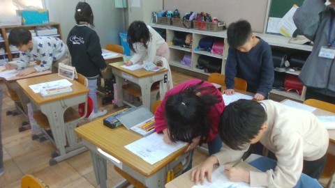 自分の成長したことをワークシートに書いた後は,自由に動いて,友達の成長したことも書きに行きました。
