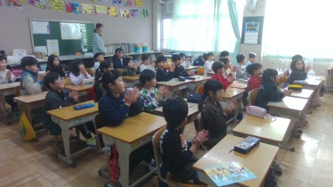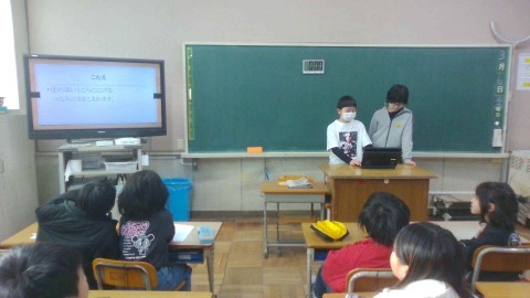 朝の時間に,5年生が総合の時間に作った「災害クイズ」をしに来てくれました。