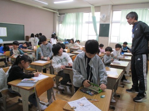2年生の様子です。1組では、音楽の先生による授業がありました。発声のしかたについて学んでいました。2組では、漢字の学習プリントに取り組んでいました。終わった人から,教室の本を読んでよいということで、本を探しに行っていました。