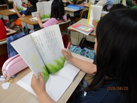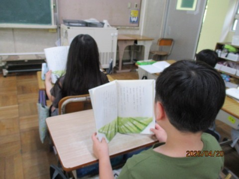 2年生の教室です。国語の時間、音読をしていました。くどうなおこさんの『ふきのとう』という文章です。雪がとけて、ふきのとうが芽をだし、春になる様子が描かれています。「音読」はとても大切です。文章を目で見て、一瞬にして、単語と助詞を見分け、意味を理解して文節で区切って読む、という大切なことを練習しています。昔から「本読み、音読」という宿題がありますが、これはとても意味があります。お忙しいとは思いますが、ご家庭でもお子様の音読を、聞いてあげてください。そして、ぜひ、「上手に読めたね」「前より上手になったね。」とほめてあげてください。