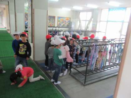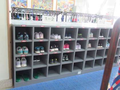 2組では、靴箱で靴の上手な片付け方についてお話を聞いていました。