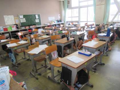 第一報の「地震です!」という放送に、まずは机の下に隠れていました。