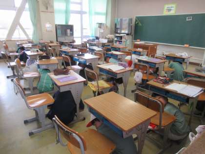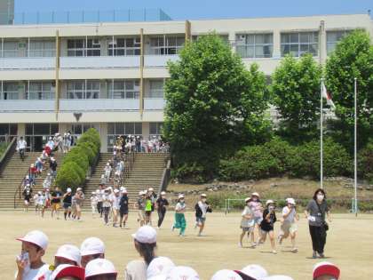 その後、「地震は収まりましたが、給食場から火が出ました。運動場に避難しましょう。」という放送があり、児童は運動場に向かいました。