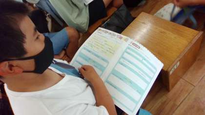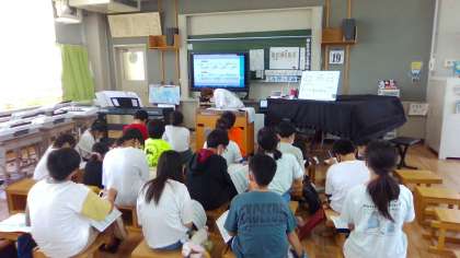 日本の楽器の音色を聞いて、どんな感じに聞こえるか話し合っていました。「正月っぽい。」や「穏やかな感じがする。」「風が強くなった感じ。」などなど、演奏の仕方によって感じ方がずいぶん違うことに気づきました。