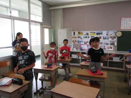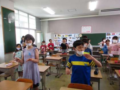 プールの後で少しお疲れでしたが、英語の勉強をがんばりました。歌を歌ったりジェスチャーを取り入れながら、時間の言い方やたずね方を学習しています。