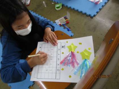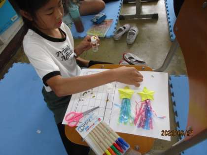 7月は七夕をイメージして作成します。一人ずつ、好きな色を選んでスズランテープを流れ星に見立てます。