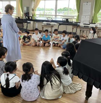 じゃんけん電車で仲良く輪になった後、リズムの学習で「名前送りゲーム」もしました。