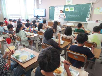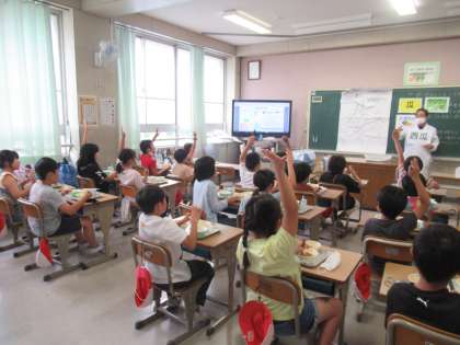 3年1組では、給食の時間を利用して食育の学習をしていました。