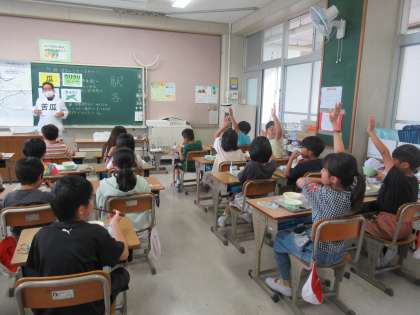 新檜尾台小学校から栄養教諭にお越しいただき、「うりうりクイズ」です。
