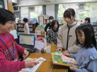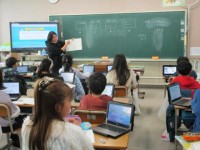 富山県の民謡「こきりこ」の学習です。学校にあった棒でつくっていただいた七寸五分のこきりこをひとり一つずつもって体験中です。