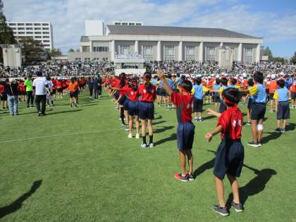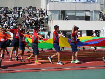 金岡陸上競技場で連合運動会が行われました。絶好の運動日和でした。開会式が終わった後、全員で堺っ子体操を踊り、スカイバルーンをしました。