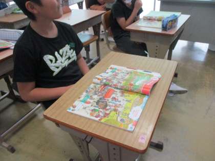5年生はLessom5 I can run fast.の学習に今日から入りました。音声を聞きながら人物を探しています。