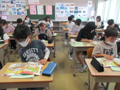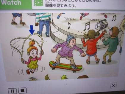 「I can jump rope.」の人物を探す活動をしました。「やったー。」「合ってた。」と楽しみながら取り組んでいました。