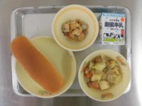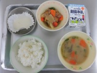 献立は、ごはん、豚汁、小松菜のお好み焼き、手作りソース、ミニフィッシュ、牛乳です...