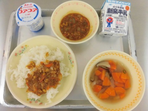献立は、ごはん・とうがんのスープ・ドライカレー・ヨーグルト・牛乳です。