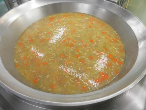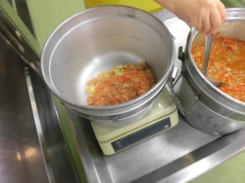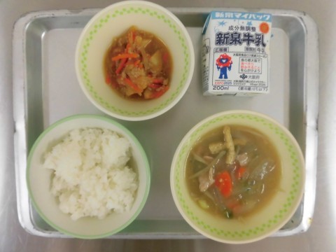 今日の献立は、ごはん、豚汁、揚げじゃがのそぼろがけ、牛乳です。