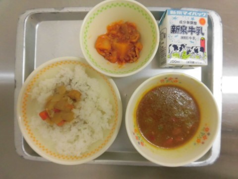 献立は、ごはん、カレモア、プアアのポリネシアンソース、牛乳です。