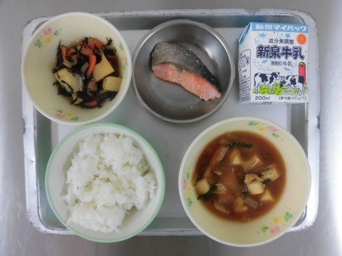 献立は、ごはん、赤だし、焼き鮭、じゃがいもの磯煮、牛乳です。