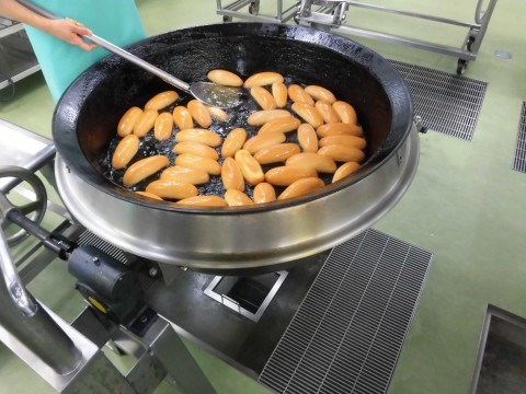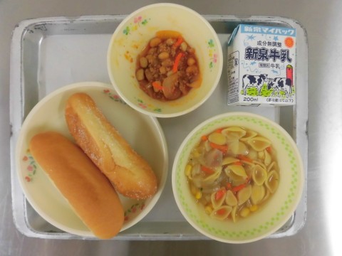 献立は、ミニパン、揚げパン、マカロニスープ、ミートビーンズ、牛乳、です。