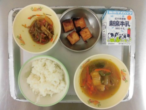 献立は、ごはん、船場汁、厚揚げ田楽、海そうきんぴら、牛乳です。