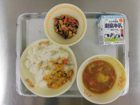 献立は、ごはん、冬野菜カレーライス、豆とひじきのサラダ、牛乳です。