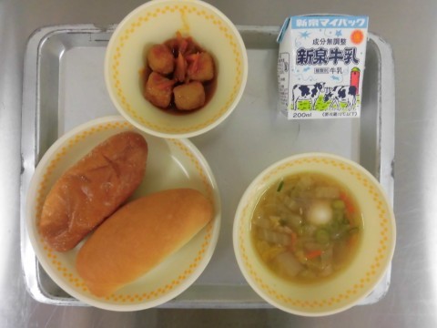 献立は、ミニパン・揚げパン、春雨とうずら卵のスープ、肉団子のケチャップ煮、牛乳です。