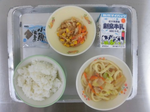 献立は、ごはん、みそ煮込みうどん、大根の塩こうじあえ、小魚の佃煮、牛乳です。