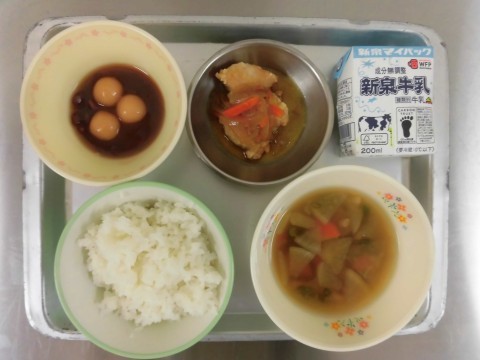 献立は、ごはん、のっぺい汁、鶏から揚げの野菜あんかけ、白玉ぜんざい、牛乳です。