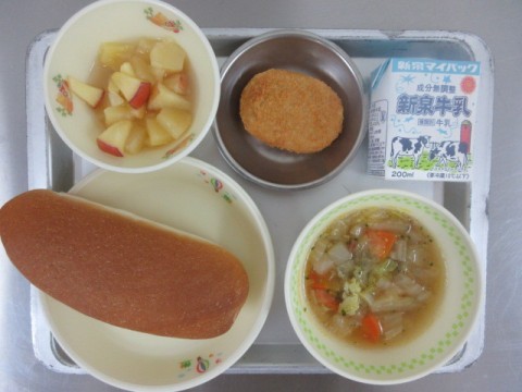 献立は、コッペパン、冬野菜スープ、コロッケ、とろりフルーツコンポート、牛乳です。