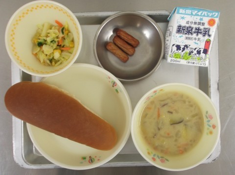献立は、黒糖パン、クマラスープ、焼きウインナー、野菜ソテー、牛乳です。