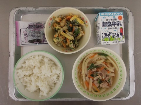 献立は、ごはん、はりはりうどん、かきあげ、昆布の佃煮、牛乳です。