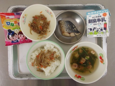 献立は、ごはん、すまし汁、さわらの風味焼き、セルフきんぴらちらし、ひなあられ、牛乳です。