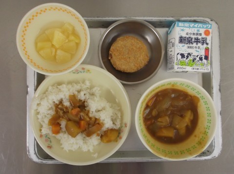 献立は、ごはん、チキンカレーライス、ミンチカツ、パインコンポート、牛乳です。