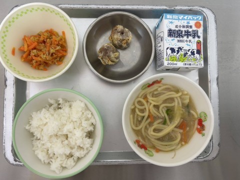 献立は、ごはん、みそラーメン、焼きシューマイ、にんじんしりしり、牛乳です。